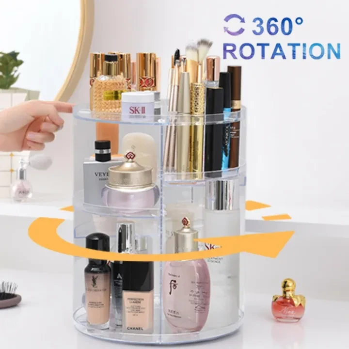 360° ঘূর্ণনযোগ্য: এই মেকআপ অর্গানাইজারটি ৩৬০ ডিগ্রি ঘোরানো যায়, যার ফলে আপনি সহজেই আপনার কসমেটিকস এবং অন্যান্য সামগ্রী খুঁজে বের করতে ও ব্যবহার করতে পারবেন। এর মজবুত ভিত্তি নিশ্চিত করে যে ঘোরানোর সময়ও সব জিনিসপত্র নিরাপদে থাকবে।